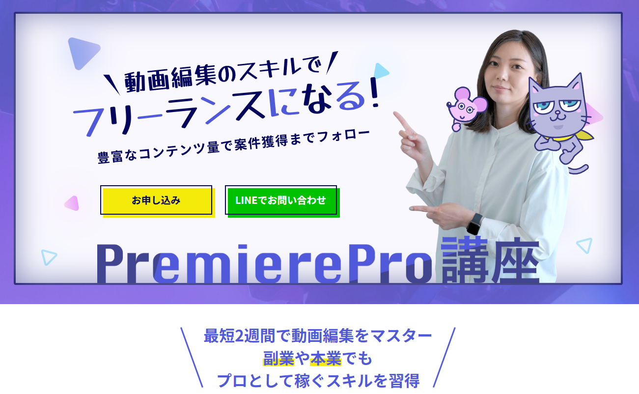 「クリエイターズジャパン(CJ-School)」は、YouTube登録者6万人超の人気講師・佐原まいを中心とした現役映像クリエイター集団が運営する、完全初心者向けの本格動画編集スクールです。動画編集スキルを独学で習得するのが難しいと感じている方に向けて、Adobe Premiere ProやAfter Effectsなどの実践操作を、わかりやすく体系的に学べるカリキュラムを提供しています。さらに、案件獲得までを視野に入れた「稼ぐためのノウハウ」や、個別LINEサポート、国内最大級のオンラインサロン(クリエイターズサロン)も併設し、学びから実践まで一貫した成長環境が整っています。■こんな方におすすめ・在宅で副業収入を得たい・フリーランスとして自由な働き方を目指したい・子育てや本業のスキマ時間でスキルを身につけたい・趣味から動画編集を始めたいが、最短で効率的に学びたい・副収入を得ながら、将来的に独立・起業も視野に入れている■学べること/得られるスキル・Adobe Premiere Pro、After Effectsを使った動画編集スキル・実際に使用されている商用案件の編集手法・サムネイル作成やテロップの入れ方、エフェクト処理などの応用技術・案件の探し方・営業方法・価格交渉のノウハウ・クライアントワークの進め方、納品までの一連の流れ■サービスの主な特徴(強み)・【圧倒的なコンテンツ量】200本以上の動画+記事コンテンツを随時更新・【初心者目線の設計】PCが苦手な方でも理解できるステップ解説・【サポート体制の手厚さ】個別LINE@サポートありで、疑問は即解決・【案件獲得ノウハウ付き】「学ぶだけで終わらない」実践型講座・【全国どこでもOK】完全オンラインなので通学不要・好きな時間に学べる■オンラインサロン(クリエイターズサロン)とは? 受講生限定で参加できるサロンでは、月1回のZoom講義や交流会、200本以上の限定コンテンツ、案件紹介など、学びと実践を融合したクリエイティブ環境が整っています。初月無料&月額1,480円で、プロとつながるチャンスが無限に広がります。■成功事例(一部抜粋)・20代会社員:「週末副業で動画編集を始め、月5万円の副収入が安定」・主婦:「育児の合間に学習し、クラウドソーシングで案件を受注」・40代転職希望者:「動画編集スキルを武器に、企業案件に参画」■料金とプラン・講座視聴権付き:初回購入特典あり(価格は公式サイト参照)・クリエイターズサロン:月額1,480円(初月無料)※Adobeソフトは別途契約が必要ですが、学生版プランなどの案内あり。■導入のステップ(とっても簡単3ステップ)① 公式サイトから申し込み:いつでもどこでも即スタートOK② 動画講座を視聴:基礎から実践まで順番に学習できる③ スキル習得後、実際に案件に挑戦:サロン経由での案件紹介もあり■他のスクールと何が違う?・現役クリエイターが運営・講師として参加 → 実務レベルで通用する内容・1,000名以上が在籍するサロン → 仲間やプロからの刺激と成長がある・低価格・高品質 → 月額1,480円のサロンは業界最安水準ながら実践的・動画で学び+相談で解決+案件で実戦 → ワンストップ学習環境■今すぐ始めるべき理由・動画編集スキルは副業・フリーランス時代において“武器”になる・トレンドは短尺・SNS動画へ → 市場の需要は今後も伸び続ける・受講生1,000人突破 → 今だからこそ学習仲間も豊富で継続しやすい・初月無料キャンペーン中!早めの申し込みで1ヶ月お得に学習可能■まとめ 動画編集は「誰にでもできる時代」だからこそ、“質”と“実践性”が重要です。CJ-Schoolでは現役の映像クリエイターが、あなたの成長をマンツーマンでサポートし、学習から実践まで一気通貫で導いてくれます。副業・フリーランス・在宅ワークを本気で実現したいあなたにぴったりのオンライン講座。まずは講座に触れて、未来の自分に投資する第一歩を踏み出してみませんか?