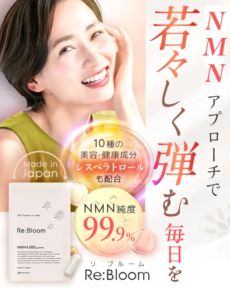 「Re:Bloom(リブルーム)」は、年齢とともに減少する補酵素前駆体である「NMN(ニコチンアミドモノヌクレオチド)」を1日換算4,500mgという高配合で導入し、さらに美容成分・ファイトケミカル・野菜10種・フルーツ7種という多角的な栄養アプローチを加えた、女性向け国内製造のオールインワンサプリメントです。年齢・仕事・家事・育児・ライフスタイルの変化で「若々しさ」「ハリ」「活力」が気になり始めた方に向けて、内側から整え、毎日に“弾む実感”をもたらすことを目指しています。 ■選ばれる理由:リブルームが支持される5つの特徴 1.高純度99.9% NMNを4,500mg配合:健康維持のため注目されるNMNを、高純度・高配合で設計。体内の補酵素NAD+へ変換される可能性に着目し、年齢による減少に備えられます。 2.美容成分3種(メロンプラセンタ・コーンセラミド・白キクラゲ多糖体)をプラス:肌・ハリ・ツヤにもアプローチする設計で、単なる健康サポートではなく“見た目”にも利く設計。 3.5種のファイトケミカル+野菜10種+果実7種という栄養設計:植物由来のケア成分と、日常で不足しがちな野菜・果物をバランス配合。内側から整え、健康感・軽さ・元気にもつなげます。 4.植物性特殊カプセル・国内GMP認定工場製造:胃で溶けにくい設計により腸まで届ける仕様、さらに製造品質管理の高い環境で作られており、安心して継続できる設計です。 5.女性のライフステージに寄り添う“習慣化できる”設計:小粒カプセル・チャック付きパウチ・定期購入特典あり。続けやすさも重要視されています。■得られるベネフィット(※効果を保証するものではありません)・“朝スッキリ”“夕方も疲れにくい”という毎日の軽さを感じられる可能性があります。 ・肌のハリ・ツヤ・くすみ対策・表情の印象アップにも繋がる“見た目変化”のスタートが期待できます。 ・食・運動・睡眠という習慣の中で、栄養補助として“ひと粒”を取り入れることで、健康・美容・活力という3方向のサポート環境が整う可能性があります。 ■導入の流れ(3ステップ) 1.公式サイトで「単品/定期コース/セット」を選択して注文。初回限定プランが用意されている場合があります。 2.毎日1〜2粒を目安に、水またはぬるま湯で服用。生活習慣と併せて継続することで実感性が高まります。 3.継続的に3〜6か月を目安に、自分の体調・キレイ感・活力の変化をチェック。必要に応じて定期コースの継続・休止・変更を検討しましょう。 ■よくある質問(Q&A) Q:NMNって何ですか? A:NMNは、体内でNAD+という補酵素となりうる物質の前駆体で、若々しさ・健康維持に関わる成分として注目されています。年齢とともに減少するため、サプリでの補給が研究されています。 Q:1日何粒飲めばいいですか? A:公式目安は1日1〜2粒。体調・食事・生活習慣に応じて調整してください。 Q:アレルギーや妊娠中でも大丈夫? A:原材料に心配な方は公式サイトの成分表示を確認の上、医師にご相談ください。 ■こんな方におすすめです ・30代〜50代の女性で、年齢とともに“以前の軽さ・ハリ・活力”が気になり始めた方 ・仕事・育児・プライベートで忙しく、毎日が“疲れた”“老けた”と感じる方 ・美容も健康もあきらめたくない、見た目も内側もケアしたいという欲張りな方 ・毎日1粒で手軽に始めたいと考えている方 ■他サプリとの違い・強み 多くのNMNサプリは「NMN単体配合」や「量が少ない」ケースが多い中、Re:Bloomは「高量NMN」「美容成分」「健康・栄養成分」をまとめて配合。さらに“女性視点”に特化した設計となっており、見た目・中身・習慣の3軸でサポートできる点が他と異なります。 ■今、始めるべき理由 ・年齢を重ねた“今”こそ、変化を感じやすいタイミング。“若々しい習慣”を早めに取り入れることで、差がつく可能性があります。 ・公式サイトでは初回限定価格・送料無料プラン・プレゼント特典などが出る場合があり、購入の好機となっています。 ■まとめ:Re:Bloom(リブルーム)は、ただのサプリではありません。“若々しさ”“ハリ”“活力”“栄養”という複数のニーズをひとつにまとめた女性のための習慣サポート策。体の内側から美しさ・元気を整える第一歩として、今日から一粒を取り入れてみませんか?まずは公式サイトで詳細をチェックし、あなたの“弾む毎日”へ向けたスタートを切りましょう。
