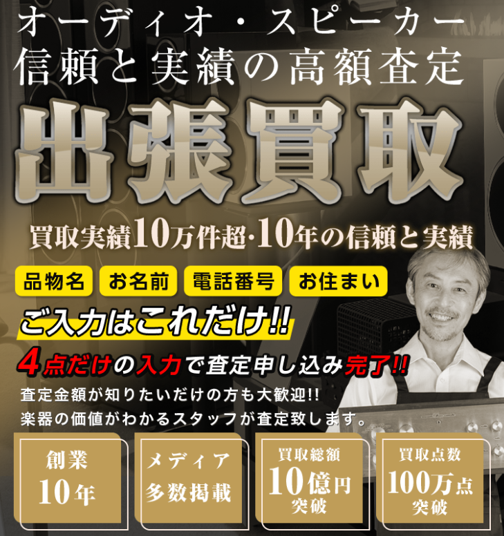 ■ 主な特徴・出張/宅配/店舗の3方式対応。最短30分で無料出張も可能。・アンプ・スピーカー・プレーヤー・ヘッドホン・ケーブルなど幅広く対応。・査定料・出張費・宅配送料・キャンセル料すべて無料。・全国対応。知識豊富な専門査定士が高額査定。