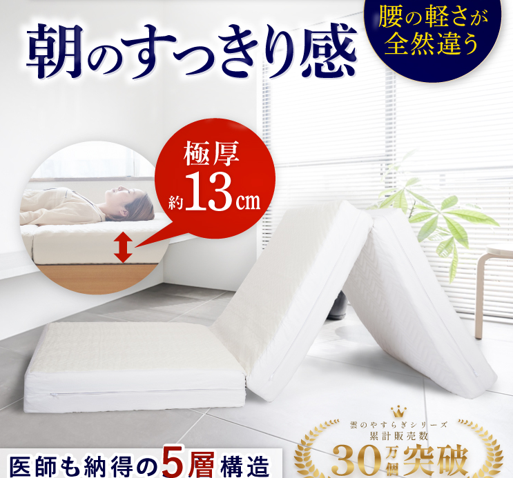 ■ まとめ 「収納性」と「寝心地」をあきらめずに手に入れるなら、雲のやすらぎプレミアム 三つ折りマットレスは理想的な選択です。「腰に優しい構造」「省スペース」「国内ブランドの安心品質」。この1台で、毎日の眠りがもっと快適に、「自然と朝が軽くなる」そんな体験を始めましょう。
