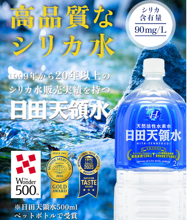■選ばれる理由:日田天領水の5つの強み 1.シリカ含有量約90 mg/L:体内で生成されないミネラル「シリカ」を効率的に補える設計。 2.天然活性水素水としての評価:深層地下水ならではの還元力・ミネラルバランスが支持されています。 3.弱アルカリ性で飲みやすい軟水:硬度も低く、日常の飲用水としても取り入れやすい。 4.源泉・採水地の信頼:大分県日田盆地の深い地層から採水され、3,600年以上の地下水という調査も。 5.味・安全性・実績あり:モンドセレクション受賞歴や、飲みやすさでも高評価を得ています。