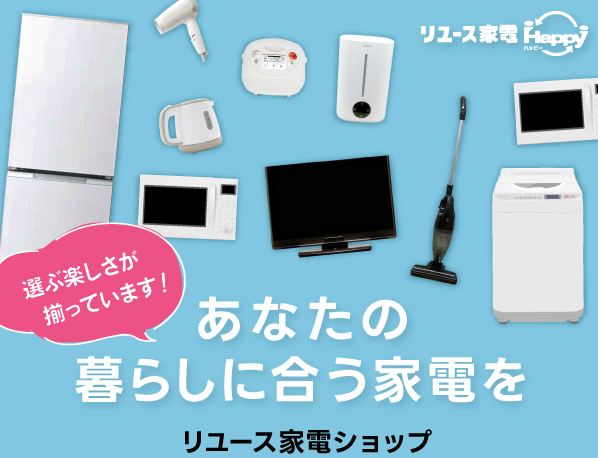 高品質な中古・リユース家電を安心価格で!リユース家電Happyは、品質保証・動作検査済み・返品OKのネットショップです。お財布にも地球にもやさしい購入体験を今すぐ。